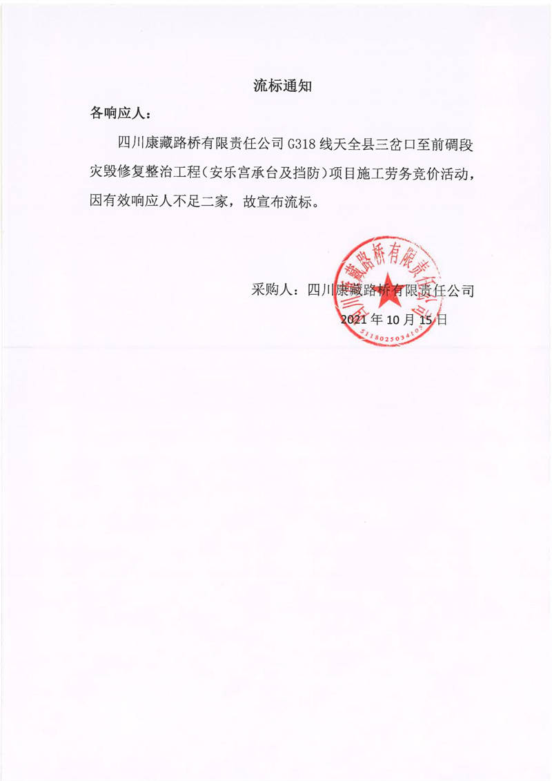 四川康藏路橋有限責任公司G318線天全縣三岔口至前碉段災(zāi)毀修復(fù)整治工程(安樂宮承臺及擋防)項目施工勞務(wù)流標通知