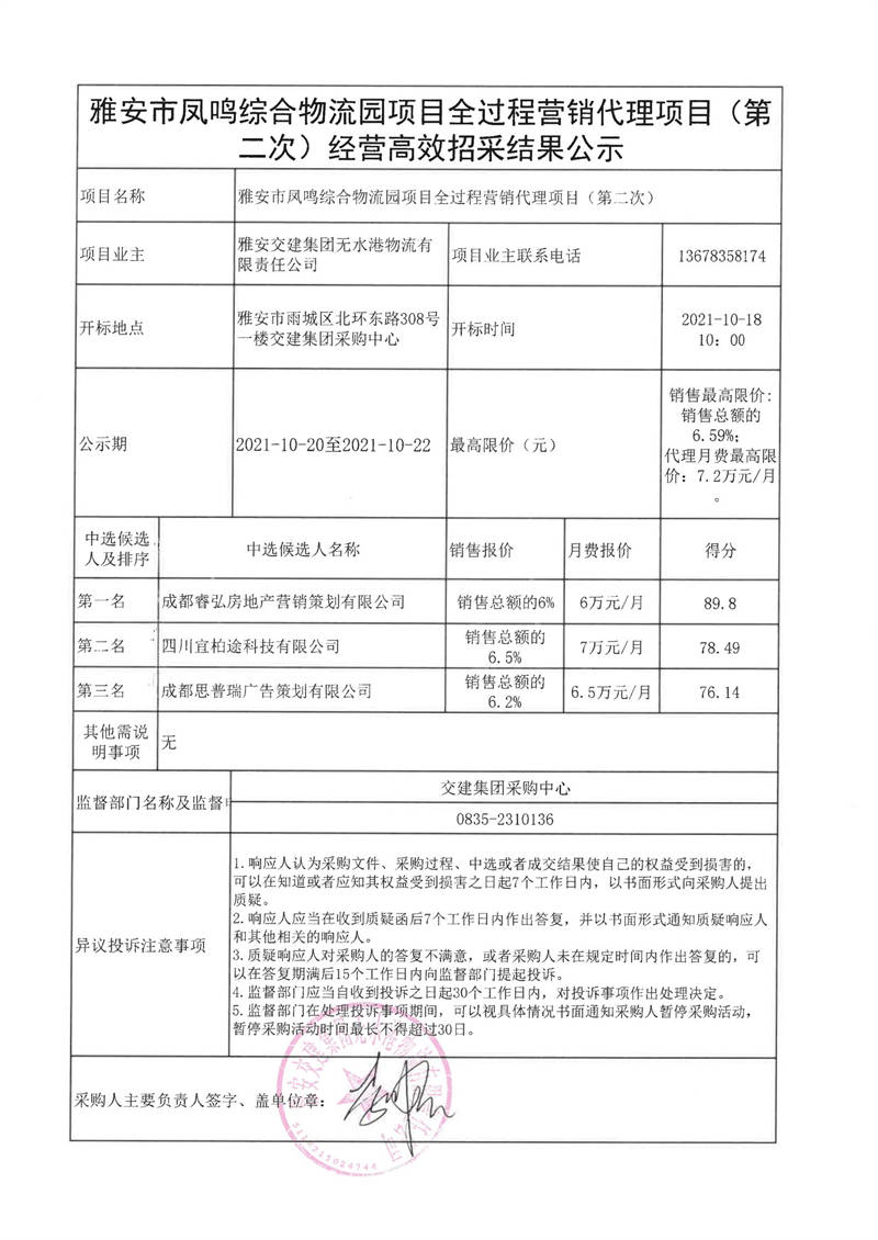 雅安交建集團(tuán)無水港物流有限責(zé)任公司雅安市鳳鳴綜合物流園項(xiàng)目全過程營(yíng)銷代理項(xiàng)目(第二次)經(jīng)營(yíng)高效招采結(jié)果公示