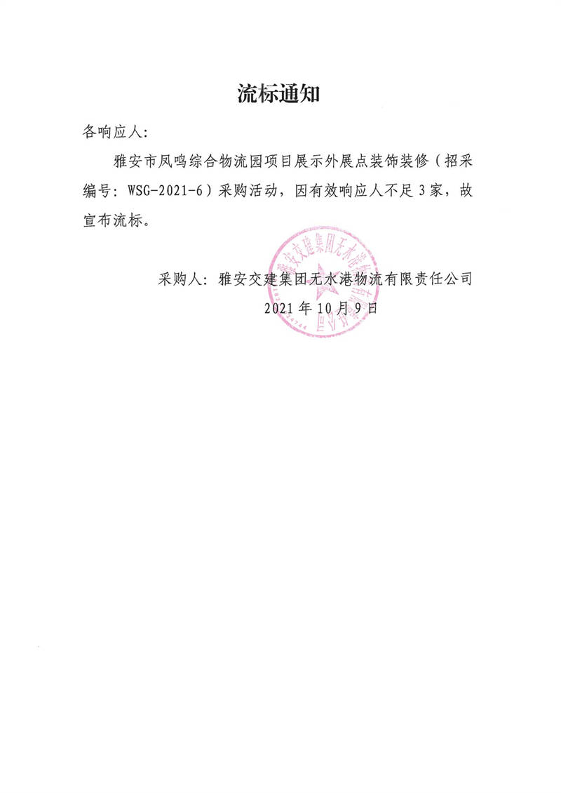 雅安交建集團(tuán)無水港物流有限責(zé)任公司雅安市鳳鳴綜合物流園項(xiàng)目展示外展點(diǎn)裝飾裝修流標(biāo)通知