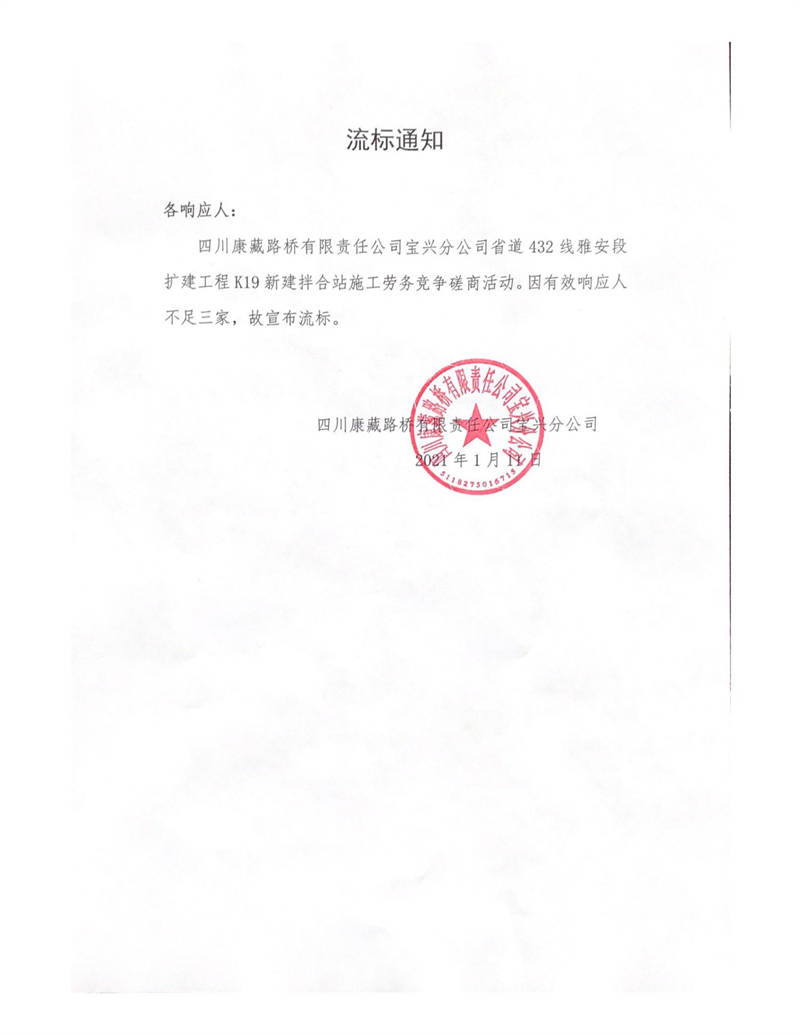 四川康藏路橋有限責(zé)任公司寶興分公司省道432線(xiàn)雅安段擴(kuò)建工程K19新建拌合站施工勞務(wù)競(jìng)爭(zhēng)磋商流標(biāo)通知