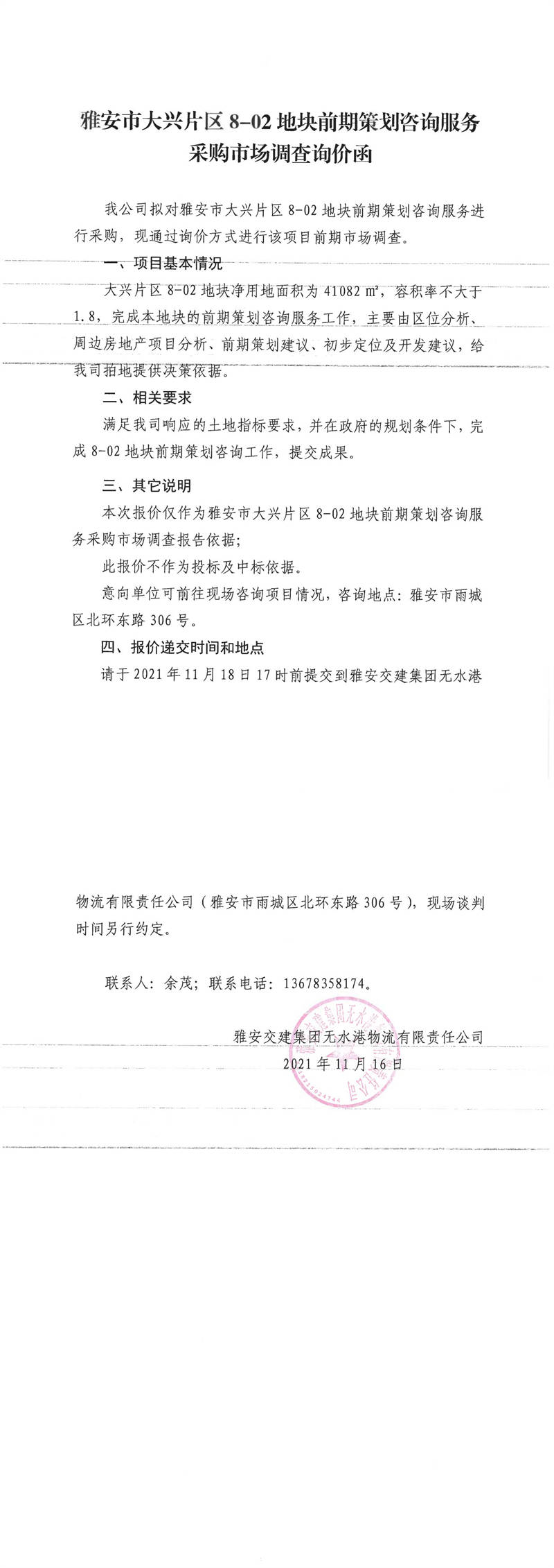 雅安交建集團(tuán)無水港物流有限責(zé)任公司雅安市大興片區(qū)8-02地塊前期策劃咨詢服務(wù)采購市場調(diào)查詢價函