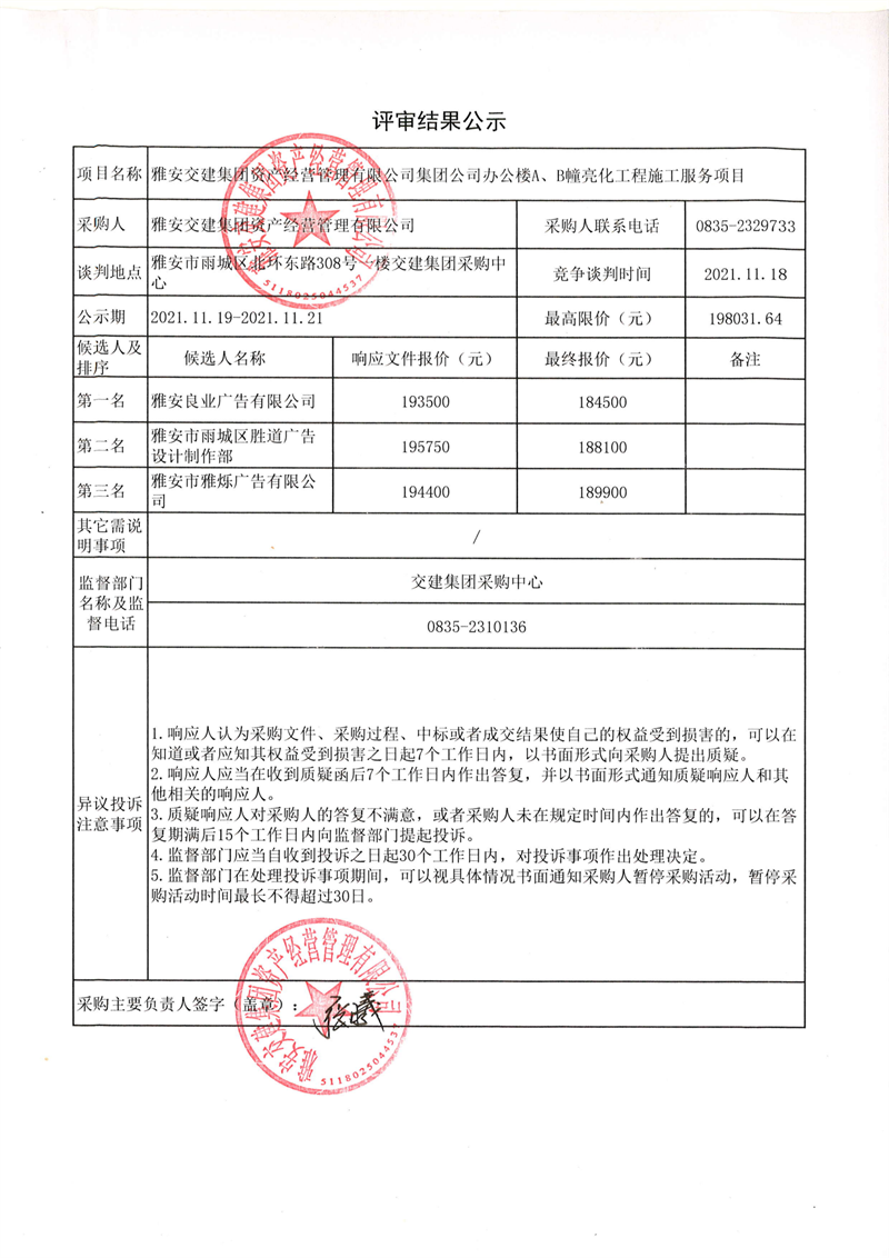 雅安交建集團資產(chǎn)經(jīng)營管理有限公司集團公司辦公樓A、B幢亮化工程施工服務(wù)項目評審結(jié)果公示
