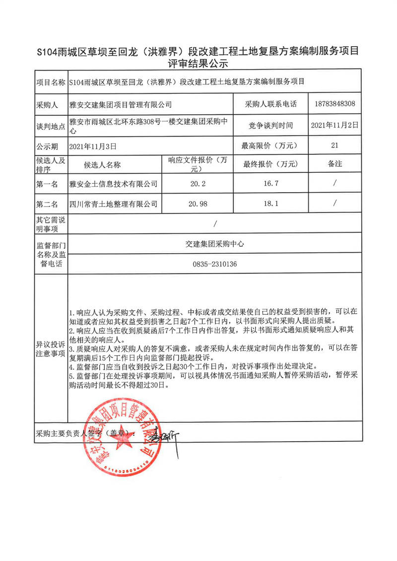 雅安交建集團項目管理有限公司S104雨城區(qū)草壩至回龍(洪雅界)段改建工程土地復(fù)墾方案編制服務(wù)項目評審結(jié)果公示
