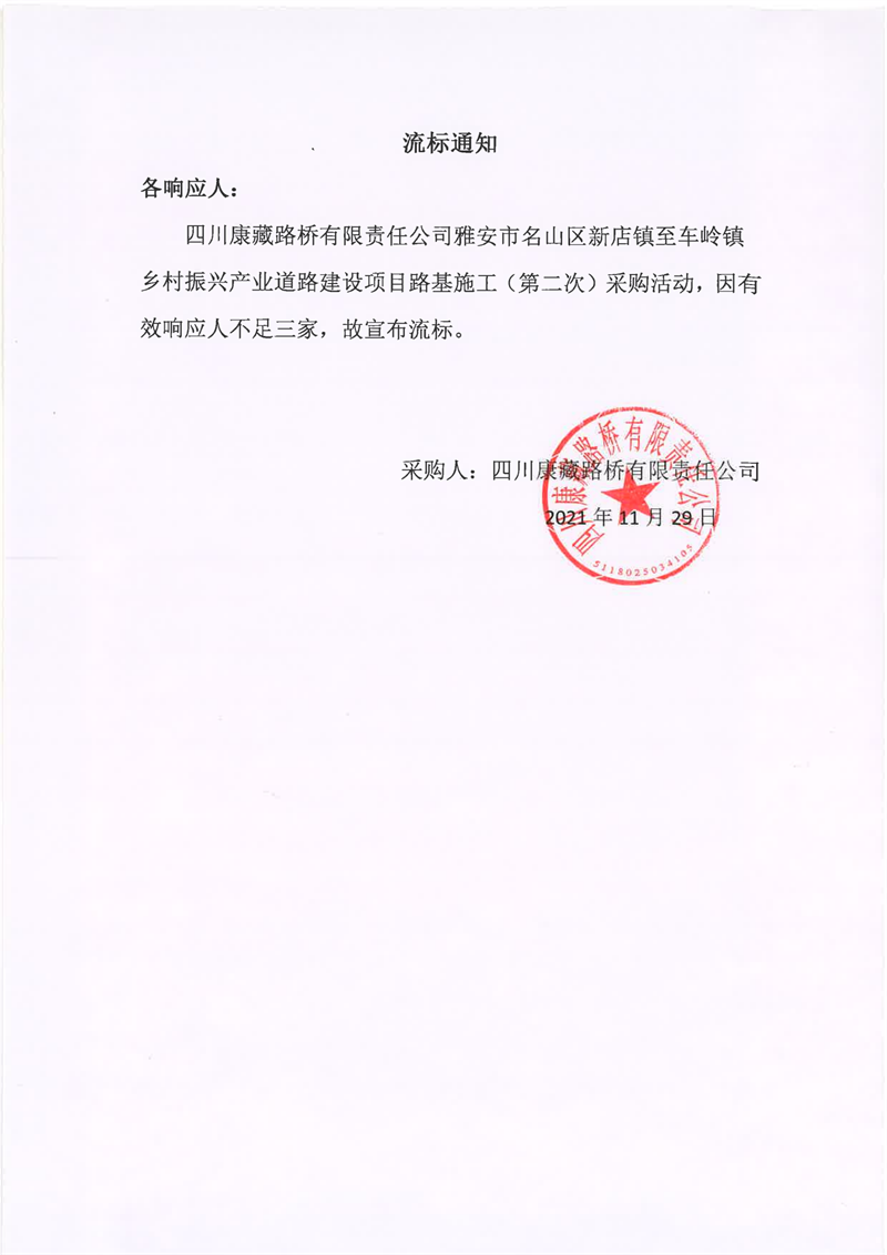 四川康藏路橋有限責(zé)任公司雅安市名山區(qū)新店鎮(zhèn)至車嶺鎮(zhèn)鄉(xiāng)村振興產(chǎn)業(yè)道路建設(shè)項目路基施工(第二次)流標(biāo)通知