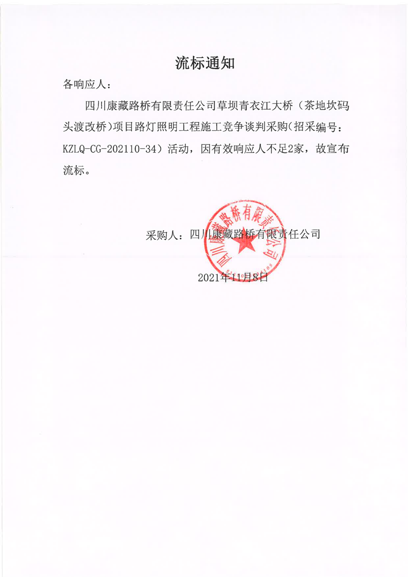 四川康藏路橋有限責任公司草壩青衣江大橋(茶地坎碼頭渡改橋)項目路燈照明工程施工流標通知
