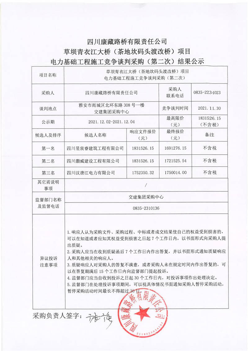 四川康藏路橋有限責(zé)任公司草壩青衣江大橋(茶地坎碼頭渡改橋)項(xiàng)目電力基礎(chǔ)工程施工競(jìng)爭(zhēng)談判采購(gòu)(第二次)結(jié)果公示
