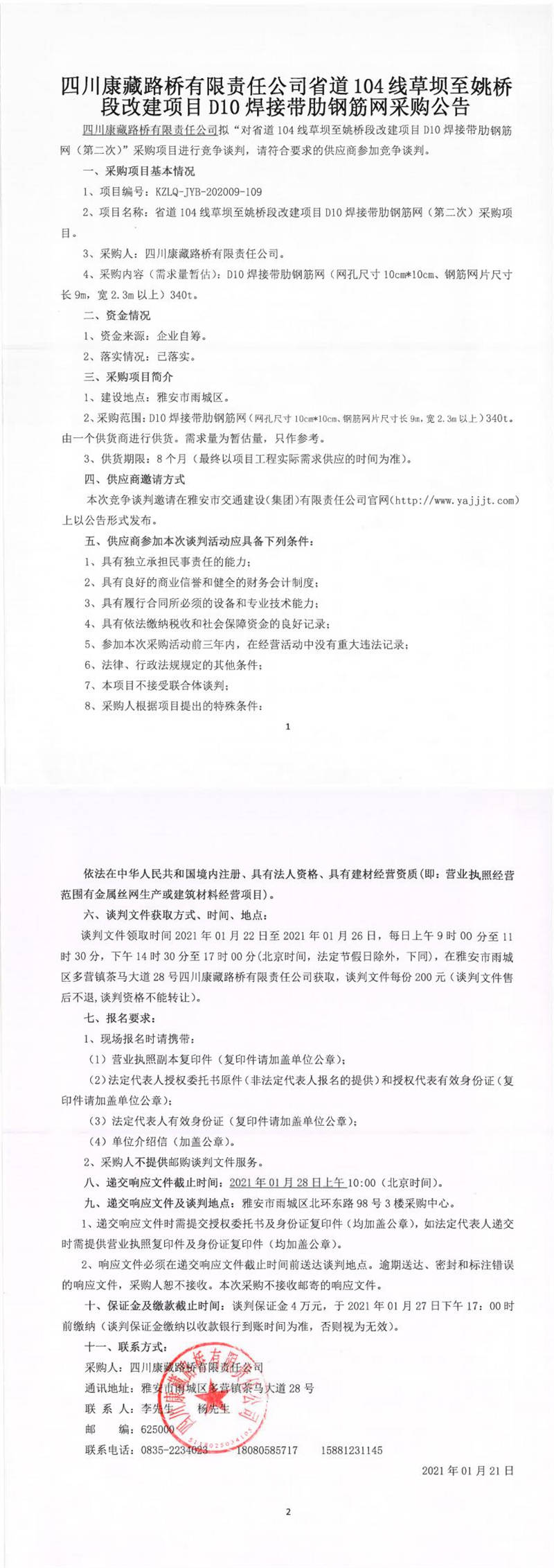 四川康藏路橋有限責任公司省道104線草壩至姚橋段改建項目D10焊接帶肋鋼筋網(第二次)采購公告