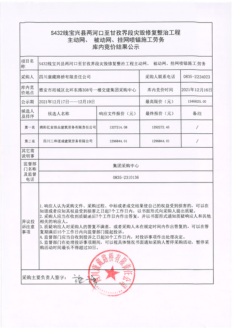 四川康藏路橋有限責(zé)任公司S432線寶興縣兩河口至甘孜界段災(zāi)毀修復(fù)整治工程主動(dòng)網(wǎng)、補(bǔ)動(dòng)網(wǎng)、掛網(wǎng)噴錨施工勞務(wù)庫內(nèi)競(jìng)價(jià)結(jié)果公示