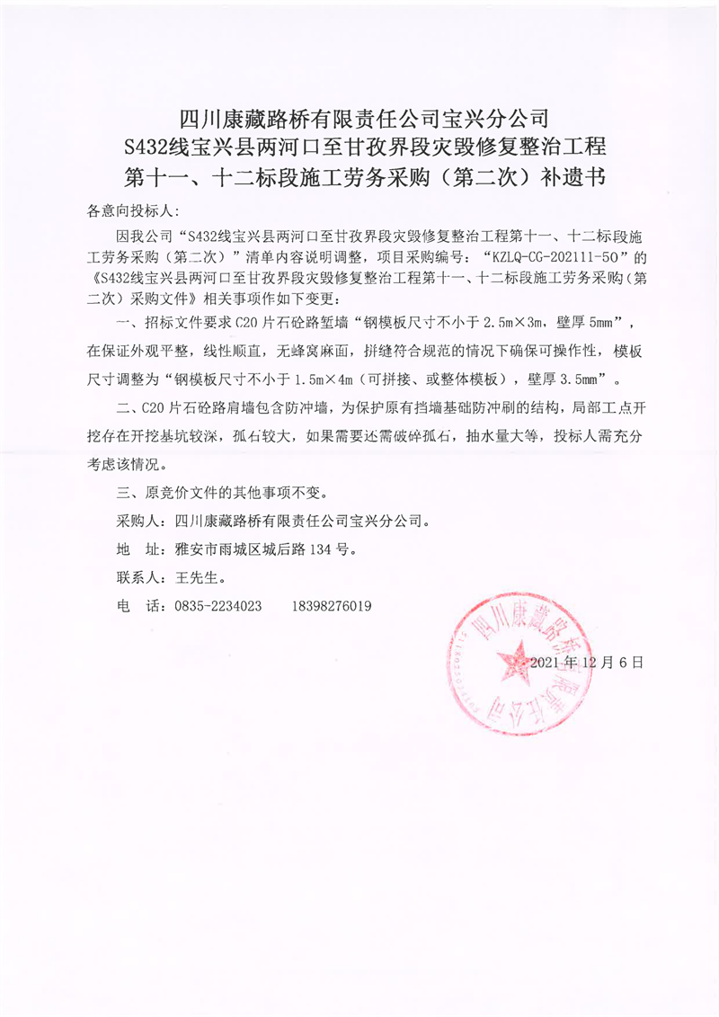 四川康藏路橋有限責(zé)任公司S432線寶興縣兩河口至甘孜界段災(zāi)毀修復(fù)整治工程第十一、十二標(biāo)段施工勞務(wù)采購(第二次)補遺書