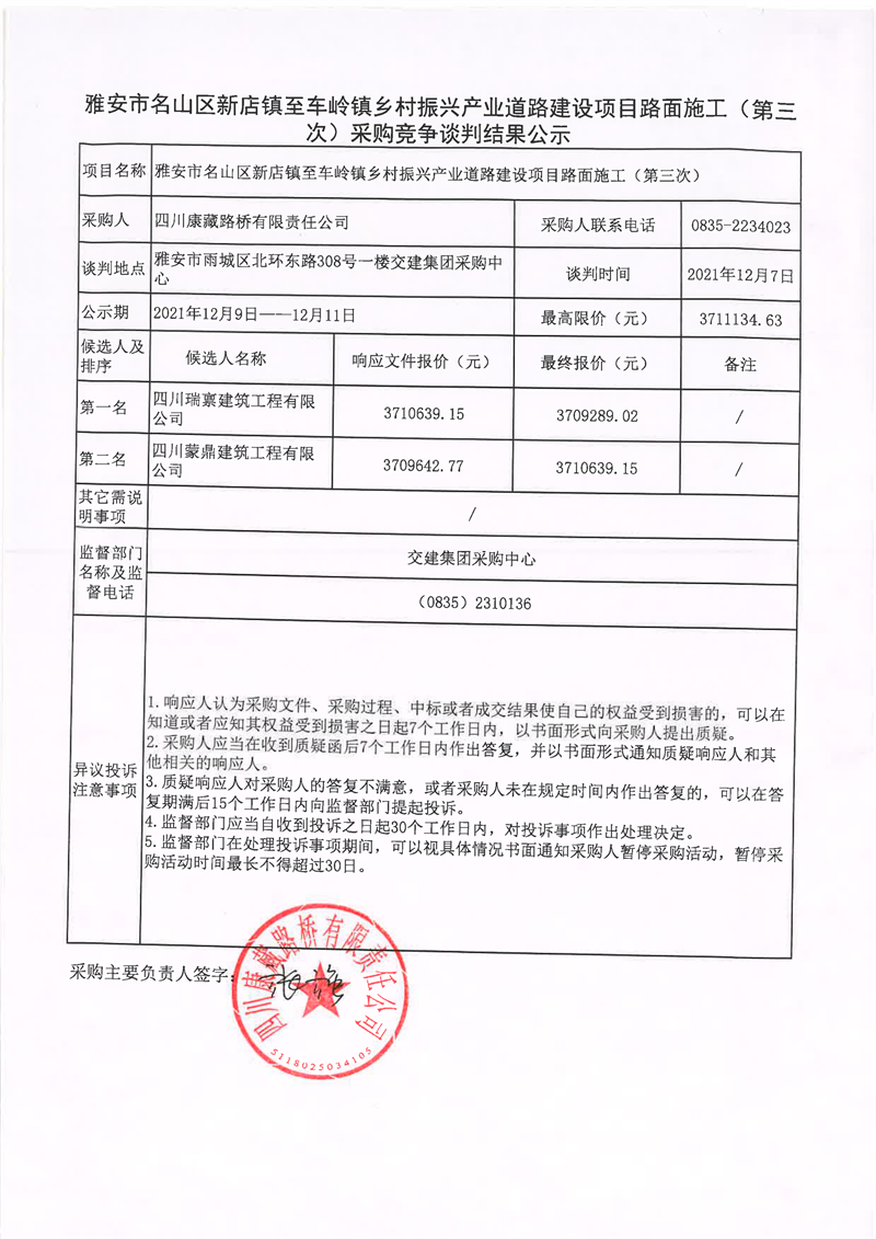 四川康藏路橋有限責任公司雅安市名山區(qū)新店鎮(zhèn)至車嶺鎮(zhèn)鄉(xiāng)村振興產(chǎn)業(yè)道路建設項目路面施工(第三次)采購競爭談判結果公示