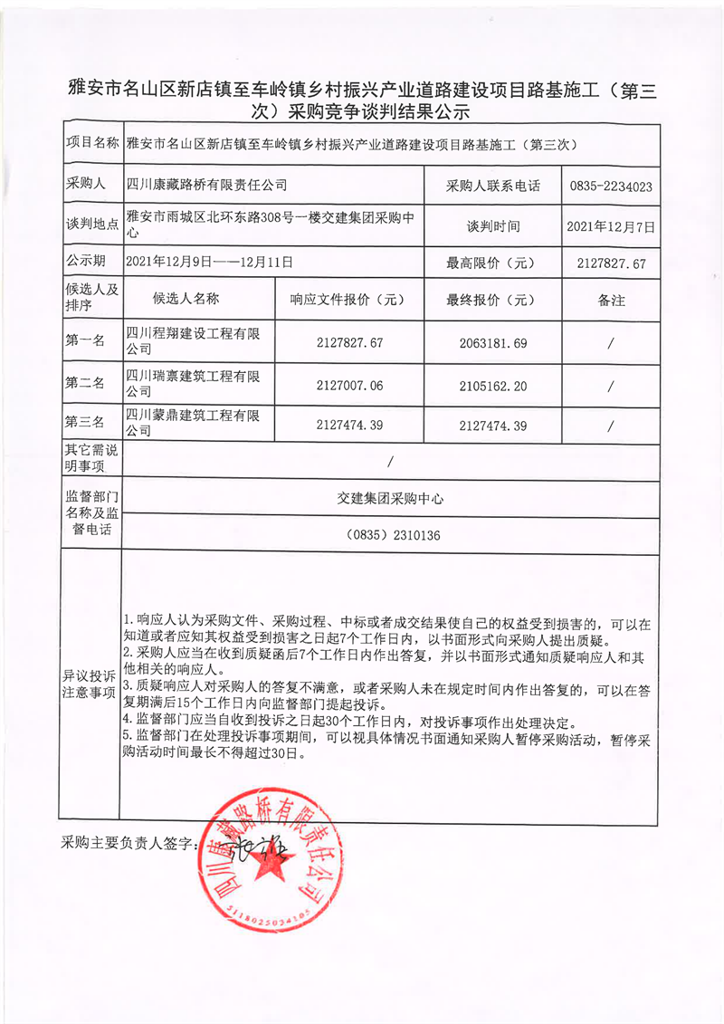四川康藏路橋有限責(zé)任公司雅安市名山區(qū)新店鎮(zhèn)至車(chē)嶺鎮(zhèn)鄉(xiāng)村振興產(chǎn)業(yè)道路建設(shè)項(xiàng)目路基施工(第三次)采購(gòu)競(jìng)爭(zhēng)談判結(jié)果公示