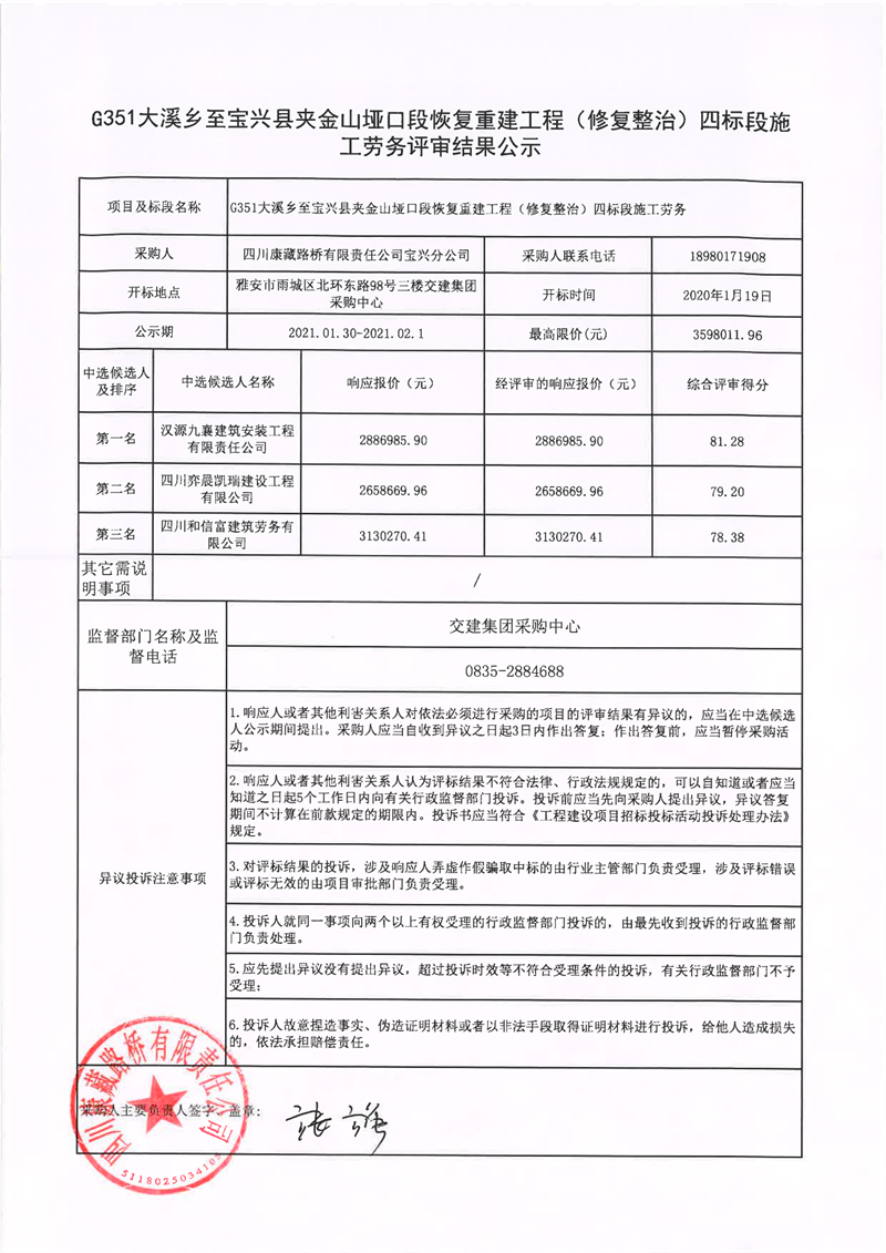 四川康藏路橋有限責(zé)任公司G351大溪鄉(xiāng)至寶興縣夾金山埡口段恢復(fù)重建工程(修復(fù)整治)四標(biāo)段施工勞務(wù)評(píng)審結(jié)果公示