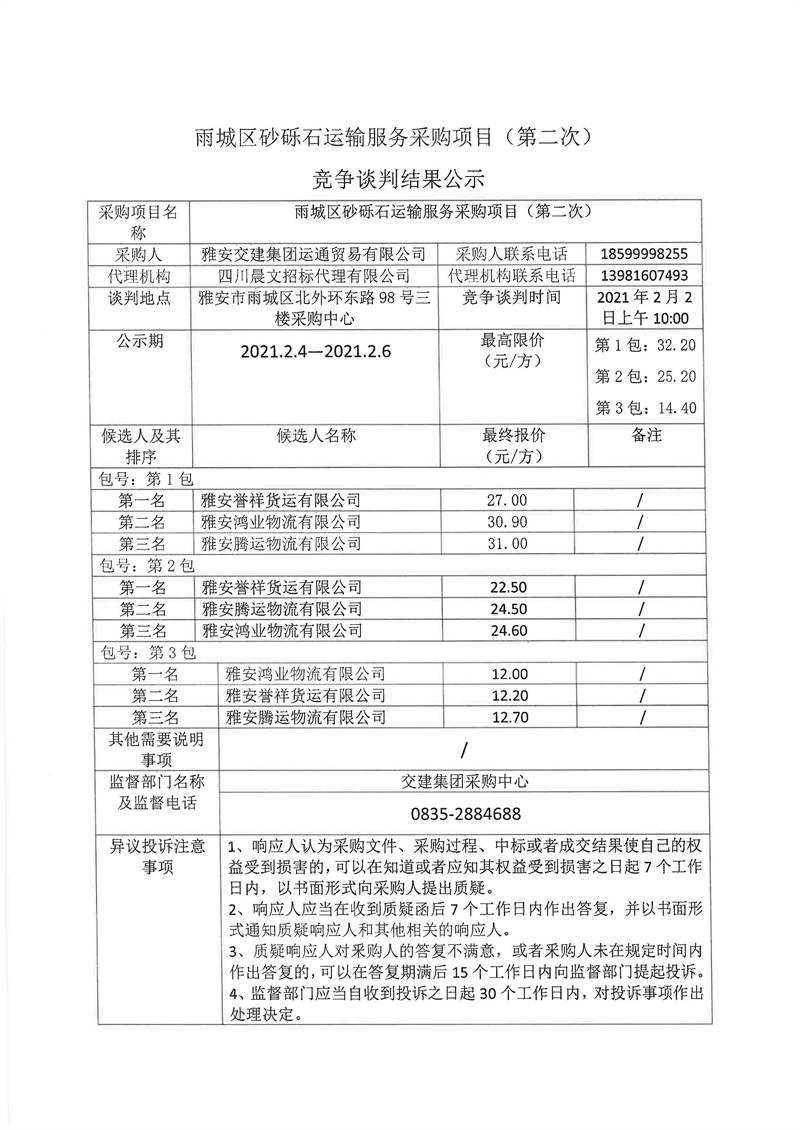 雅安交建集團(tuán)運(yùn)通貿(mào)易有限公司雨城區(qū)砂礫石運(yùn)輸服務(wù)采購(gòu)項(xiàng)目(第二次)競(jìng)爭(zhēng)談判結(jié)果公示
