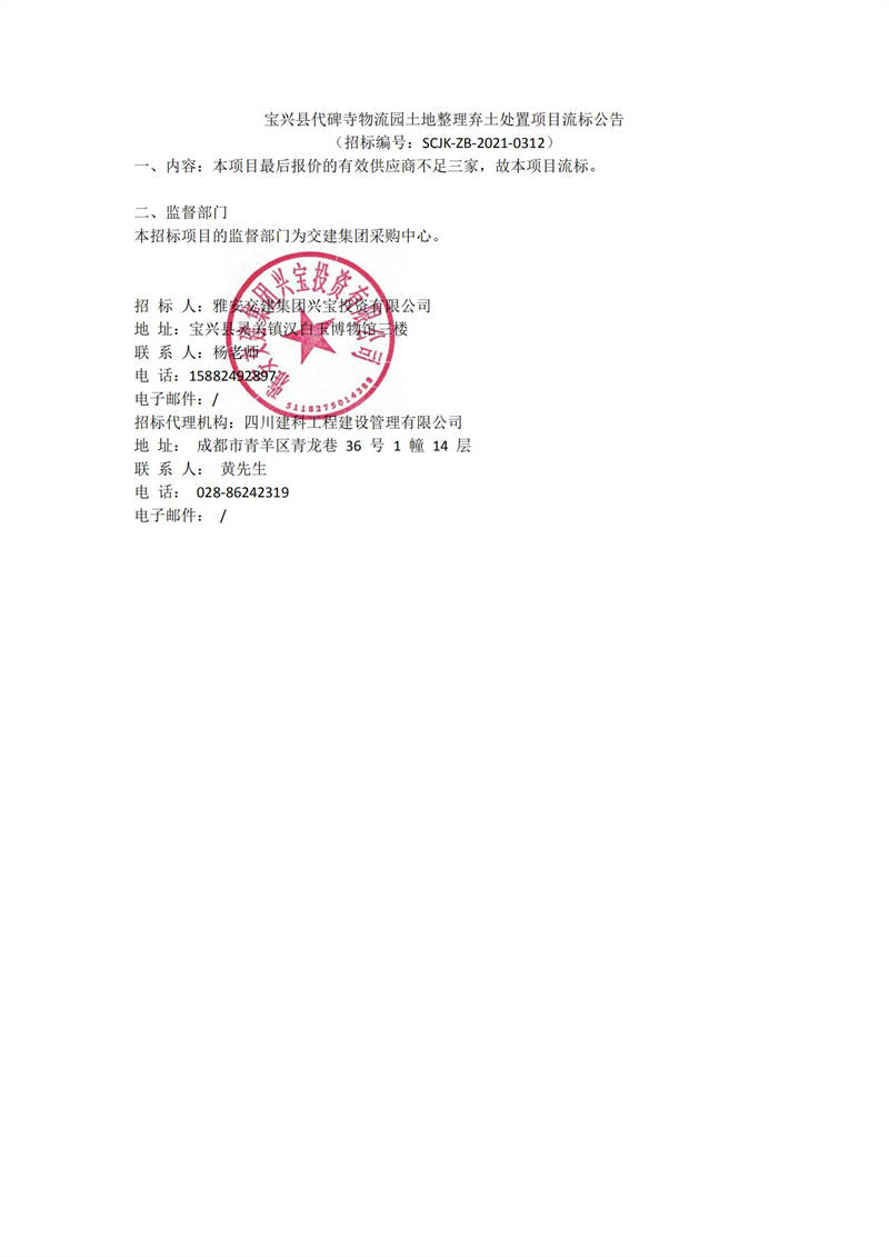 雅安交建集團(tuán)興寶投資有限公司寶興縣代碑寺物流園土地整理棄土處置項目流標(biāo)公告