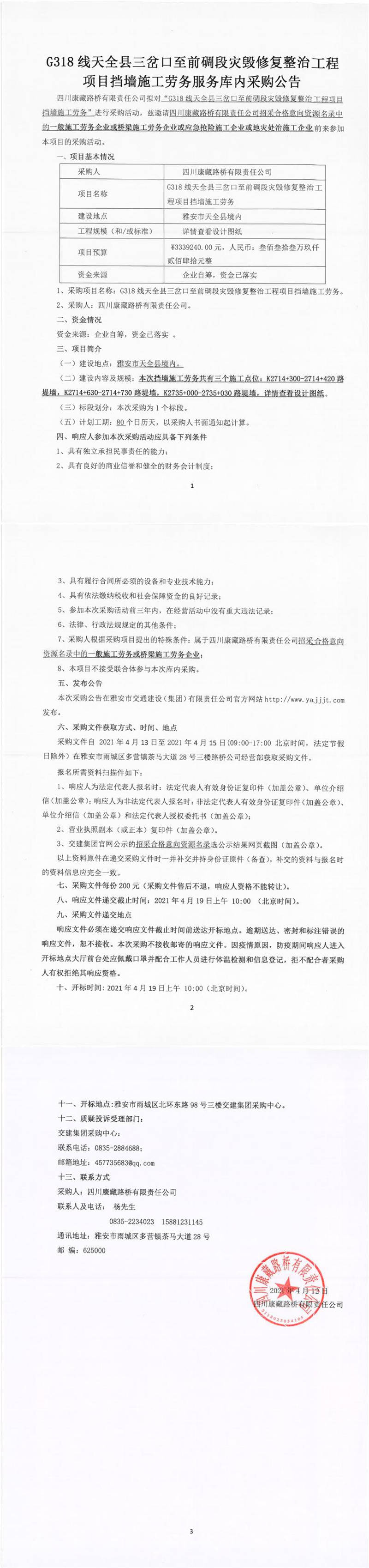 四川康藏路橋有限責(zé)任公司G318線天全縣三岔口至前碉段災(zāi)毀修復(fù)整治工程項(xiàng)目擋墻施工勞務(wù)服務(wù)庫內(nèi)采購公告