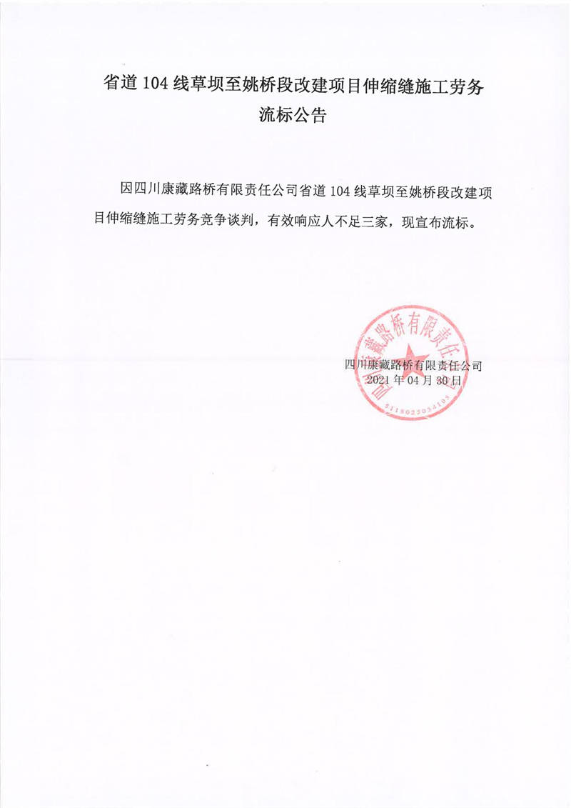 四川康藏路橋有限責任公司省道104線草壩至姚橋段改建項目伸縮縫施工勞務(wù)流標公告