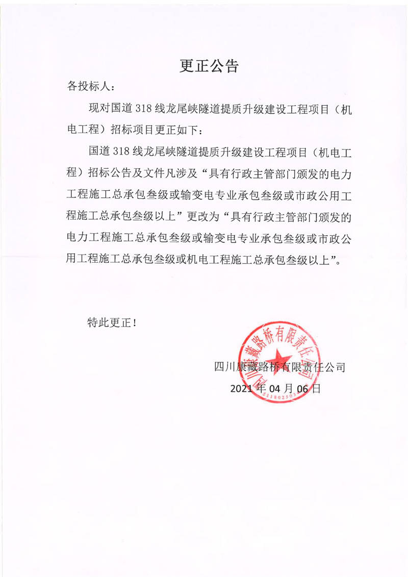 四川康藏路橋有限責任公司國道318線龍尾峽隧道提質升級建設工程項目(機電工程)更正公告