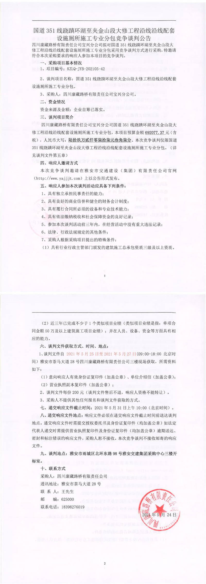 四川康藏路橋有限責(zé)任公司寶興分公司國道351線蹺磧環(huán)湖至夾金山段大修工程沿線沿線配套設(shè)施廁所施工專業(yè)分包競爭談判公告