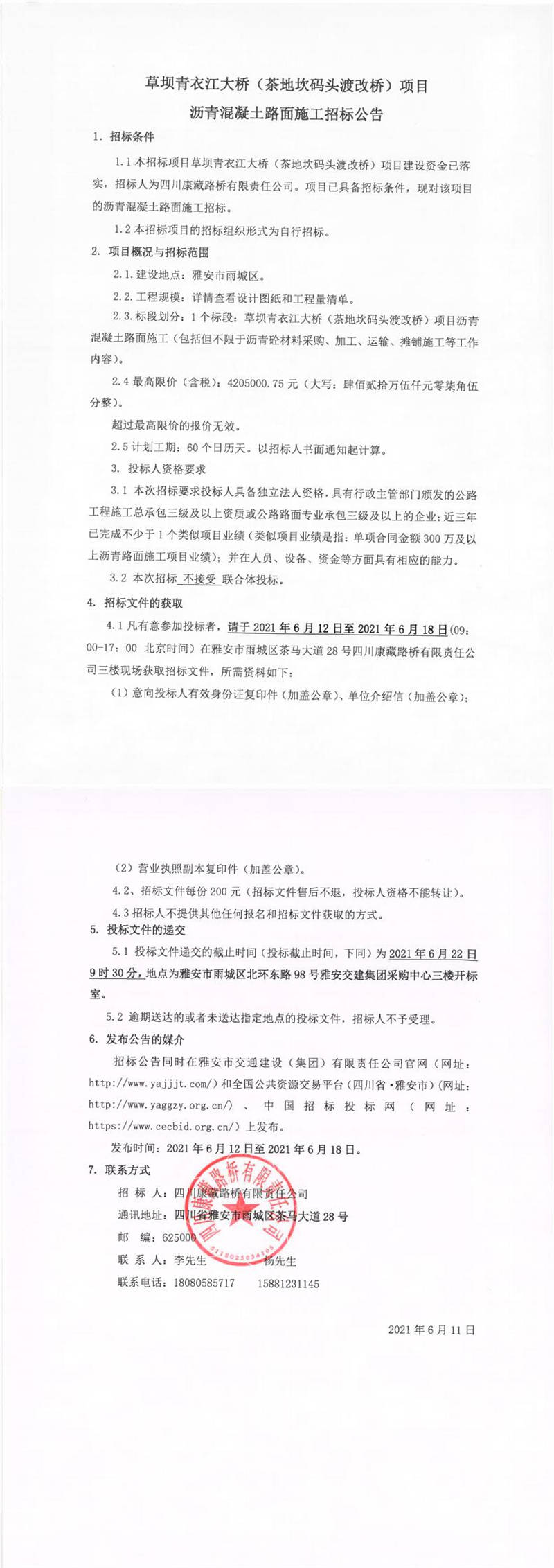 四川康藏路橋有限責(zé)任公司草壩青衣江大橋(茶地坎碼頭渡改橋)項(xiàng)目瀝青混凝土路面施工招標(biāo)公告