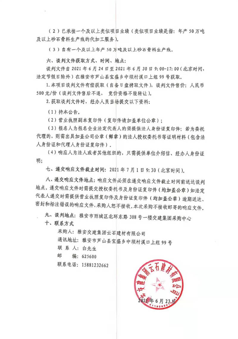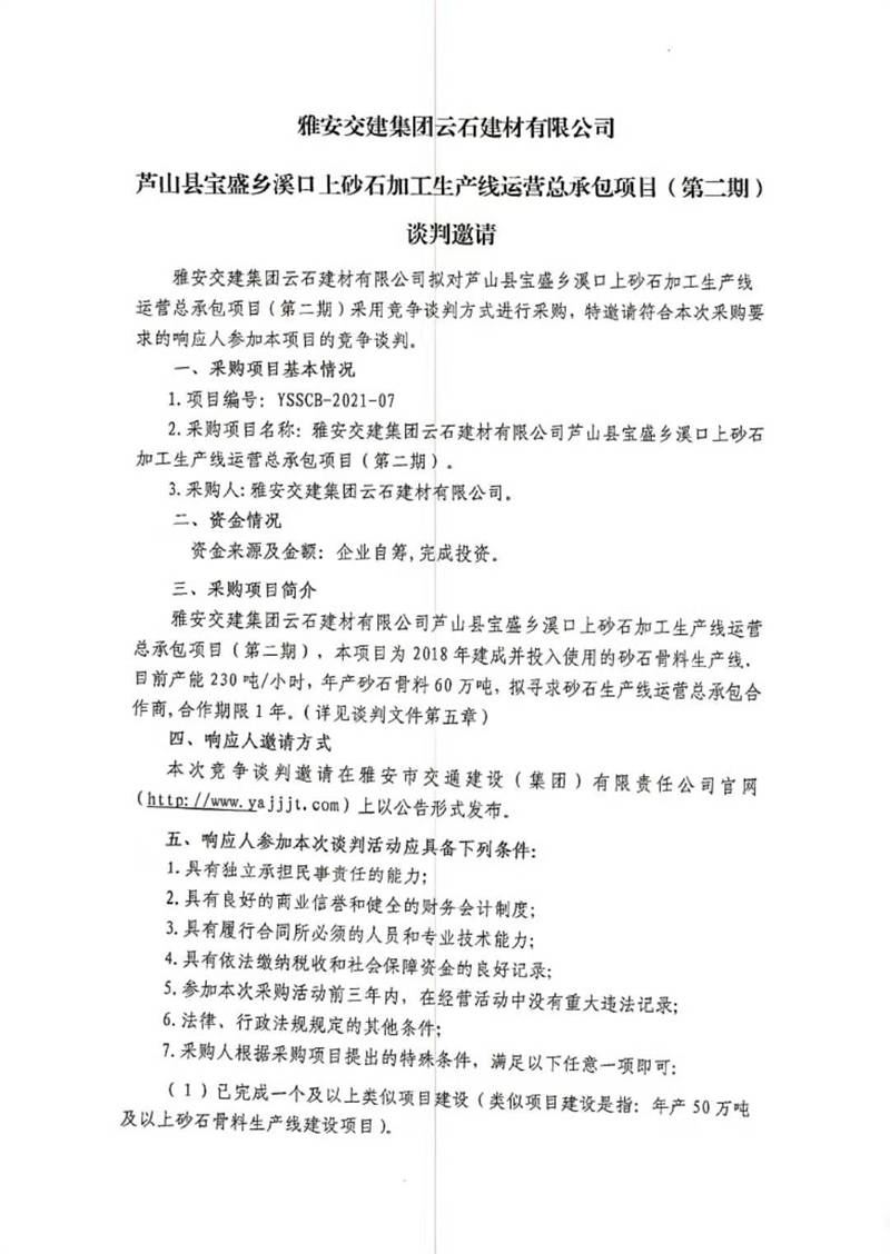 雅安交建集團云石建材有限公司蘆山縣寶盛鄉(xiāng)溪口上砂石加工生產(chǎn)線運營總承包項目(第二期)競爭談判公告