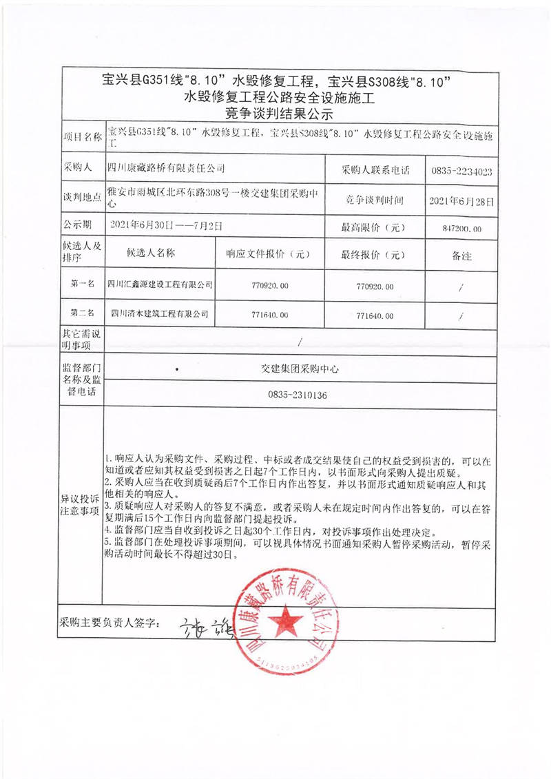 四川康藏路橋有限責任公司寶興縣G351線“8.10”水毀修復工程,寶興縣S308線水毀修復工程公路安全設施施工競爭談判結果公示