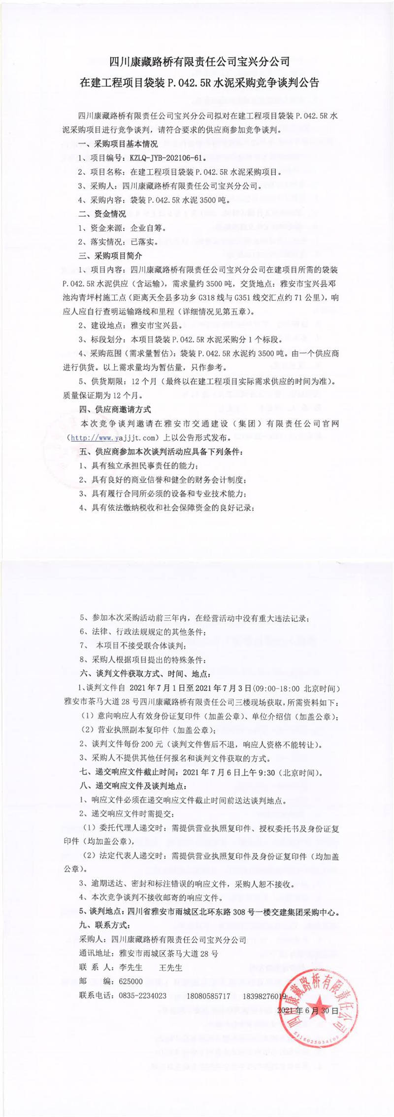 四川康藏路橋有限責(zé)任公司寶興分公司在建工程項(xiàng)目袋裝P.042.5R水泥采購競爭談判公告