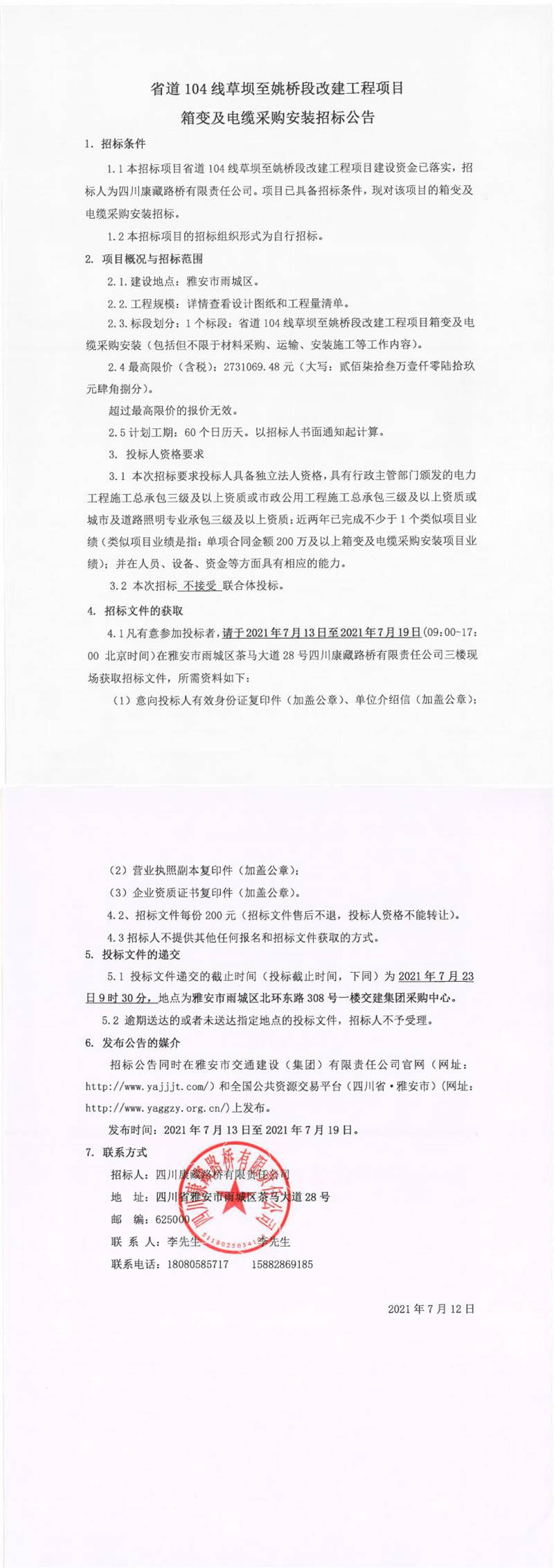 四川康藏路橋有限責(zé)任公司省道104線草壩至姚橋段改建項(xiàng)目箱變及電纜采購(gòu)安裝招標(biāo)公告