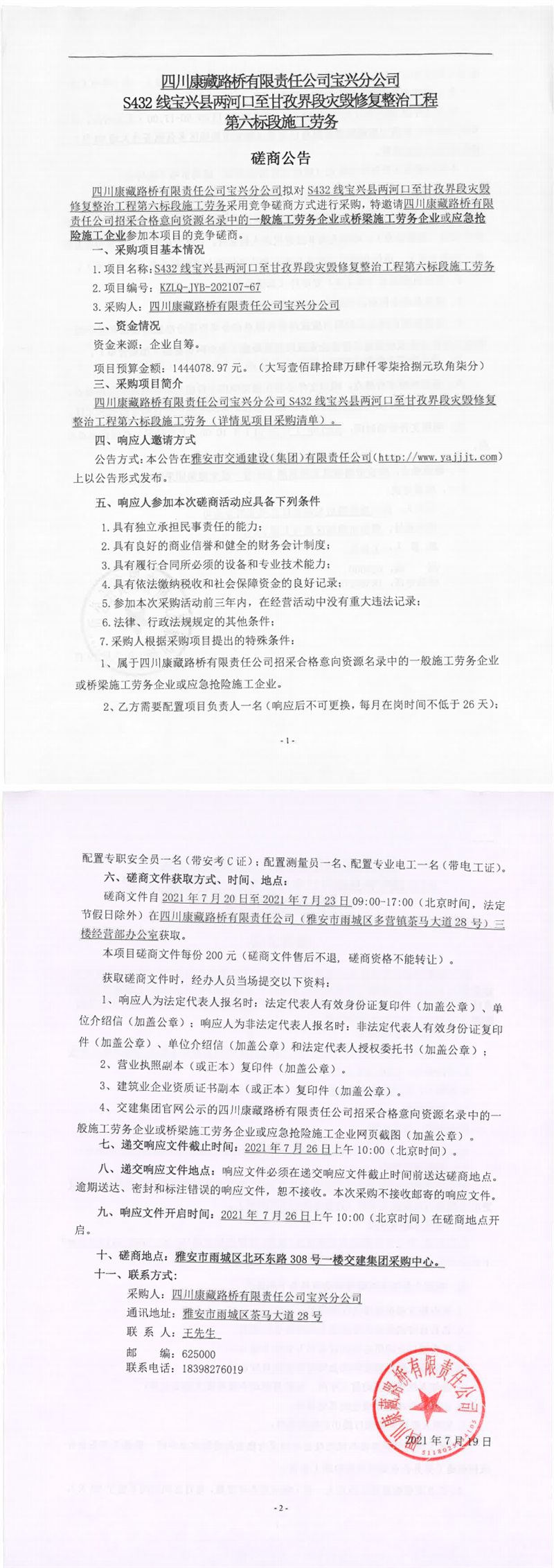 四川康藏路橋有限責(zé)任公司寶興分公司S432線寶興縣兩河口至甘孜界段災(zāi)毀修復(fù)整治工程第六標(biāo)段施工勞務(wù)磋商公告