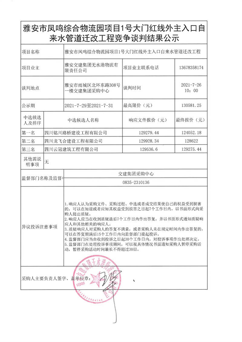雅安交建集團(tuán)無水港物流有限責(zé)任公司雅安市鳳鳴綜合物流園項目1號大門紅線外主入口自來水管道遷改工程競爭談判結(jié)果公示