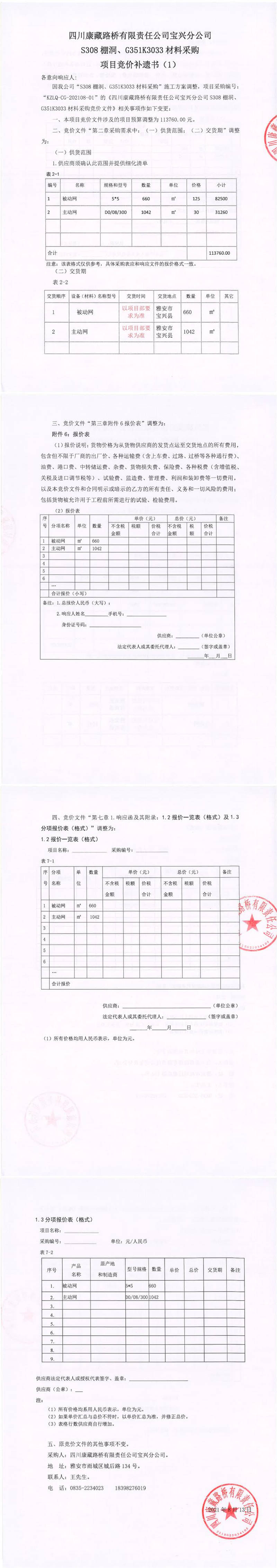四川康藏路橋有限責(zé)任公司寶興分公司S308棚洞、G351K3033材料采購項(xiàng)目競價補(bǔ)遺書(1)