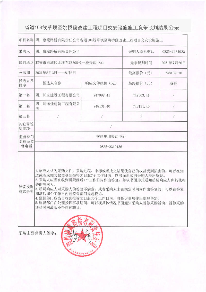 四川康藏路橋有限責(zé)任公司省道104線草壩至姚橋段改建工程項目交安設(shè)施施工競爭談判結(jié)果公示