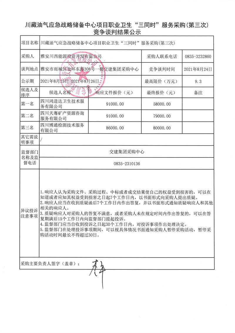 雅安川西能源投資開發(fā)有限公司川藏油氣應(yīng)急戰(zhàn)略儲備中心項(xiàng)目職業(yè)衛(wèi)生“三同時(shí)”服務(wù)采購(第三次)競爭談判結(jié)果公示