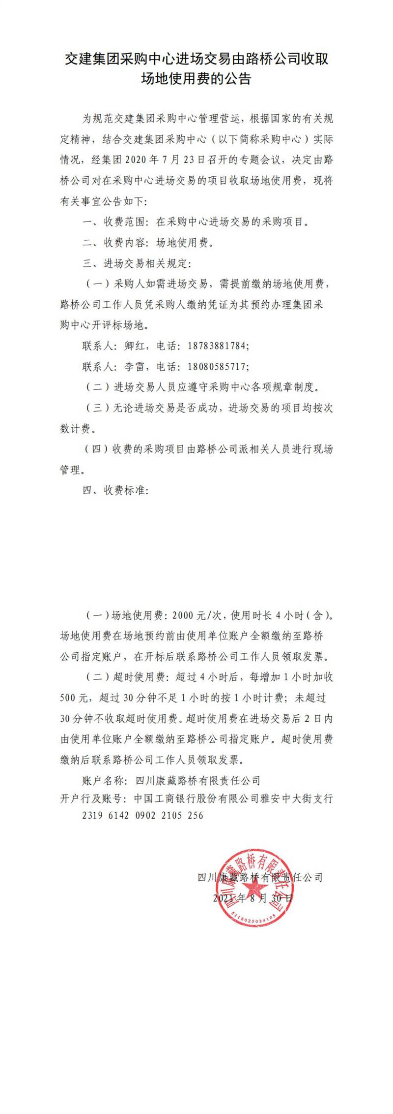 交建集團采購中心進場交易由路橋公司收取場地使用費的公告