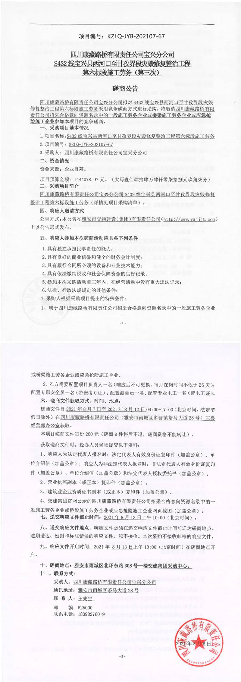 四川康藏路橋有限責任公司寶興分公司S432線寶興縣兩河口至甘孜界段災(zāi)毀修復(fù)整治工程第六標段施工勞務(wù)(第三次)競爭磋商公告