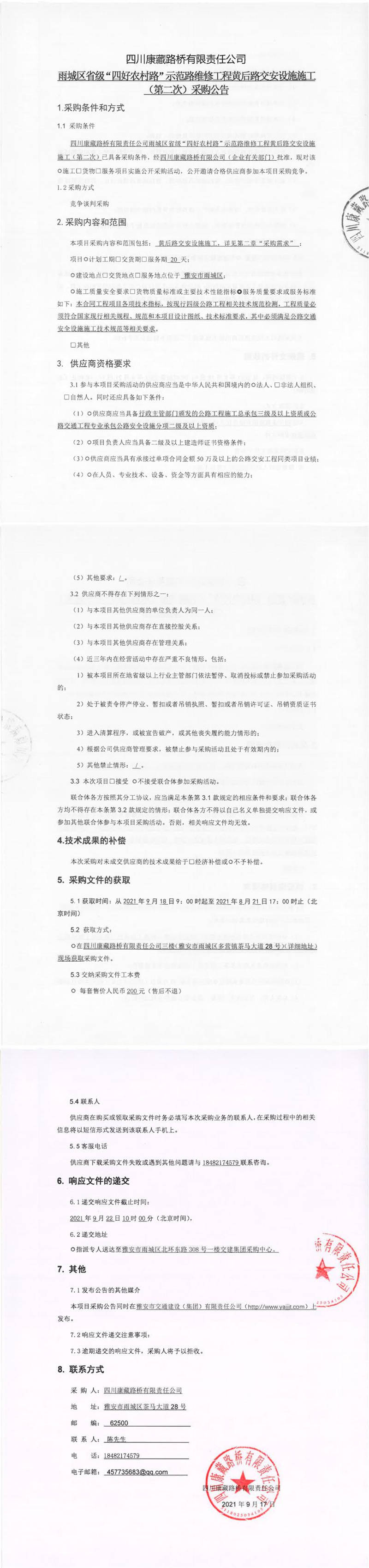 四川康藏路橋有限責(zé)任公司雨城區(qū)省級(jí)“四好農(nóng)村路”示范路維修工程黃后路交安設(shè)施施工(第二次)采購(gòu)公告