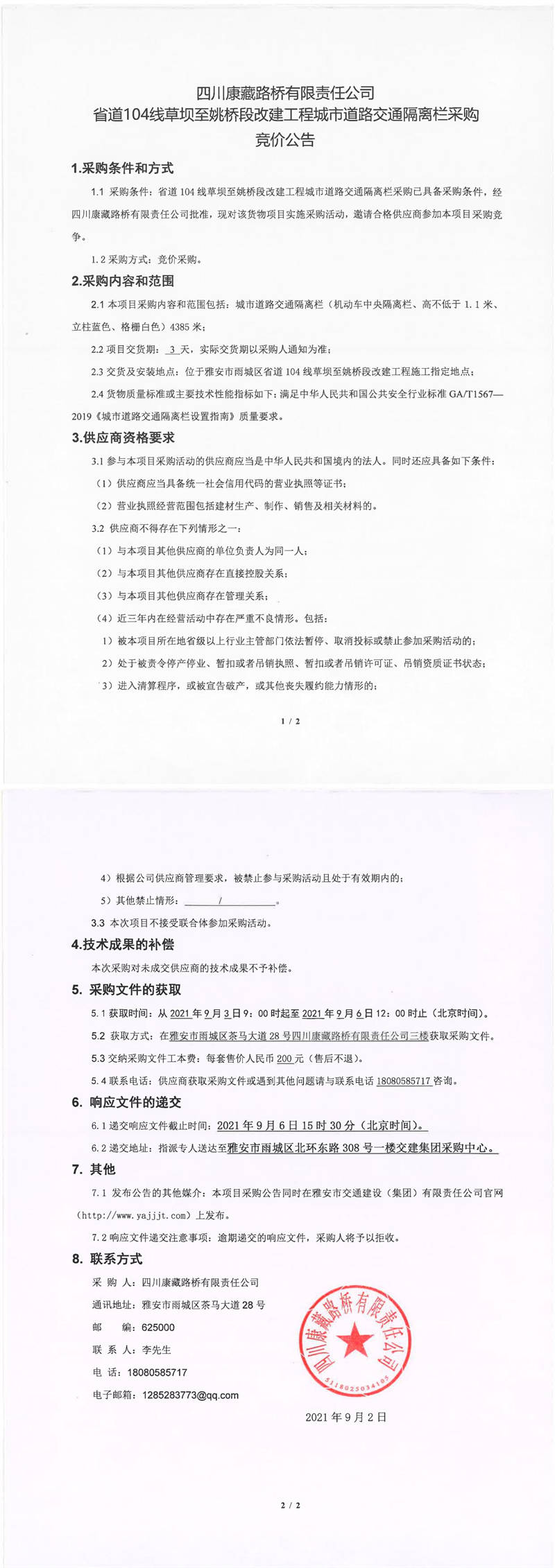 四川康藏路橋有限責(zé)任公司省道104線草壩至姚橋段改建工程城市道路交通隔離欄采購競(jìng)價(jià)公告