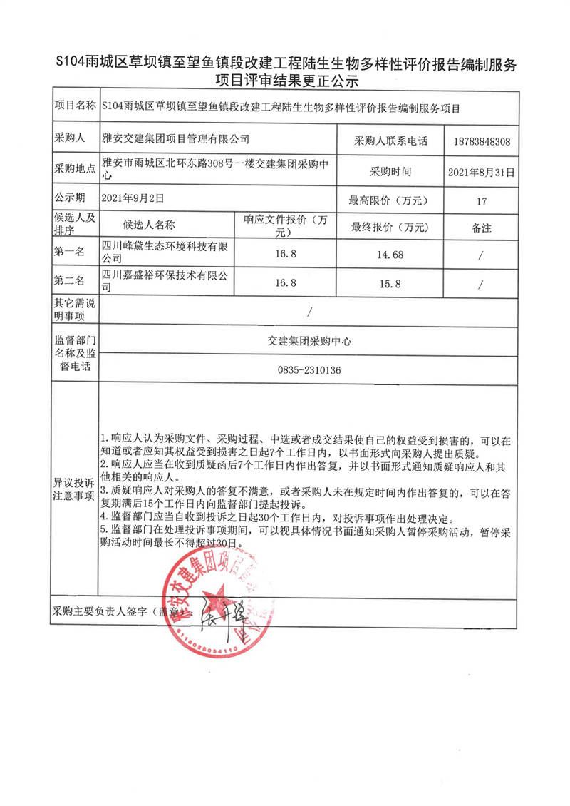 雅安交建集團項目管理有限公司S104雨城區(qū)草壩鎮(zhèn)至望魚鎮(zhèn)段改建工程陸生生物多樣性評價報告編制服務(wù)項目評審結(jié)果更正公示