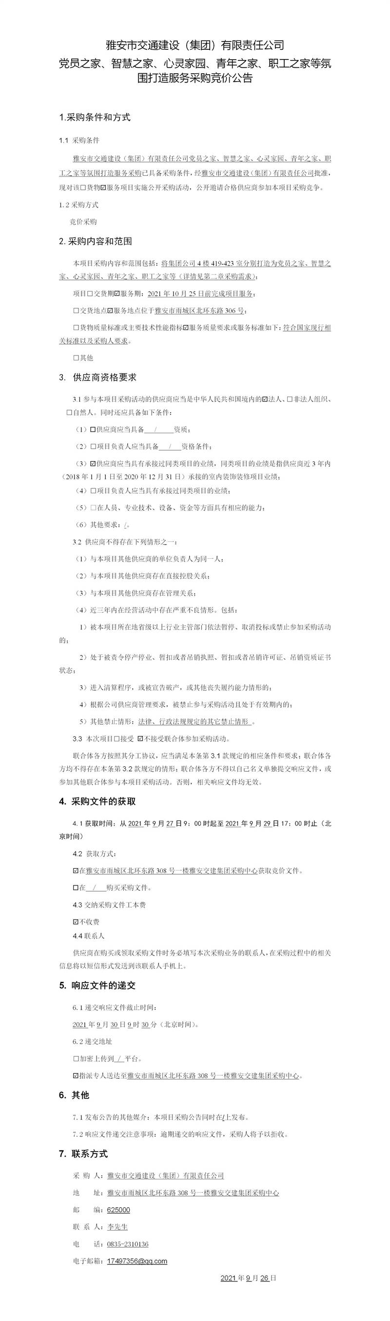 雅安市交通建設(shè)(集團)有限責(zé)任公司黨員之家、智慧之家、心靈家園、青年之家、職工之家等氛圍打造服務(wù)采購競價公告