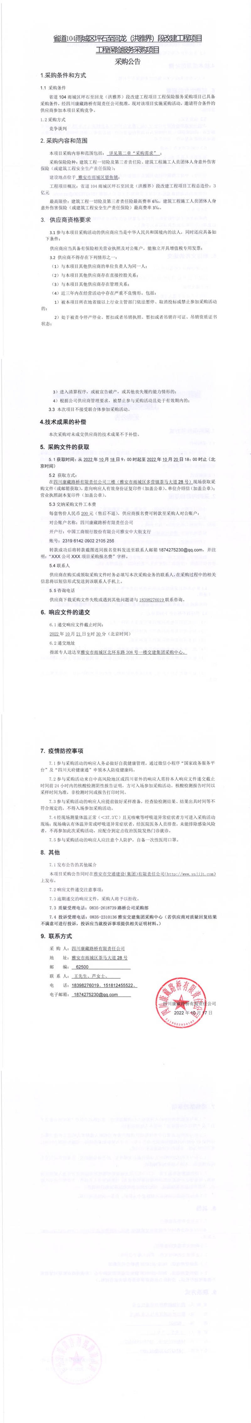 四川康藏路橋有限責任公司省道104雨城區(qū)坪石至回龍(洪雅界)段改建工程項目工程保險服務采購項目采購公告