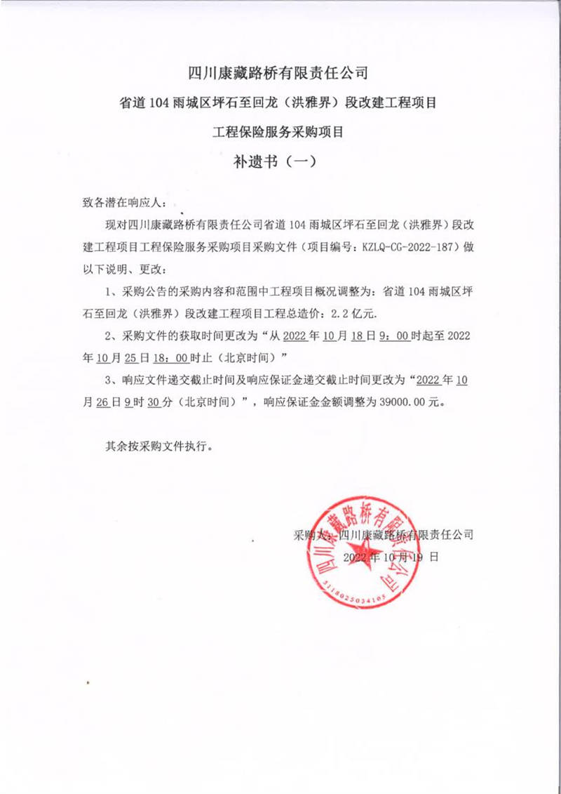 四川康藏路橋有限責(zé)任公司省道104雨城區(qū)坪石至回龍(洪雅界)段改建工程項目工程保險服務(wù)采購項目補(bǔ)遺書(一)