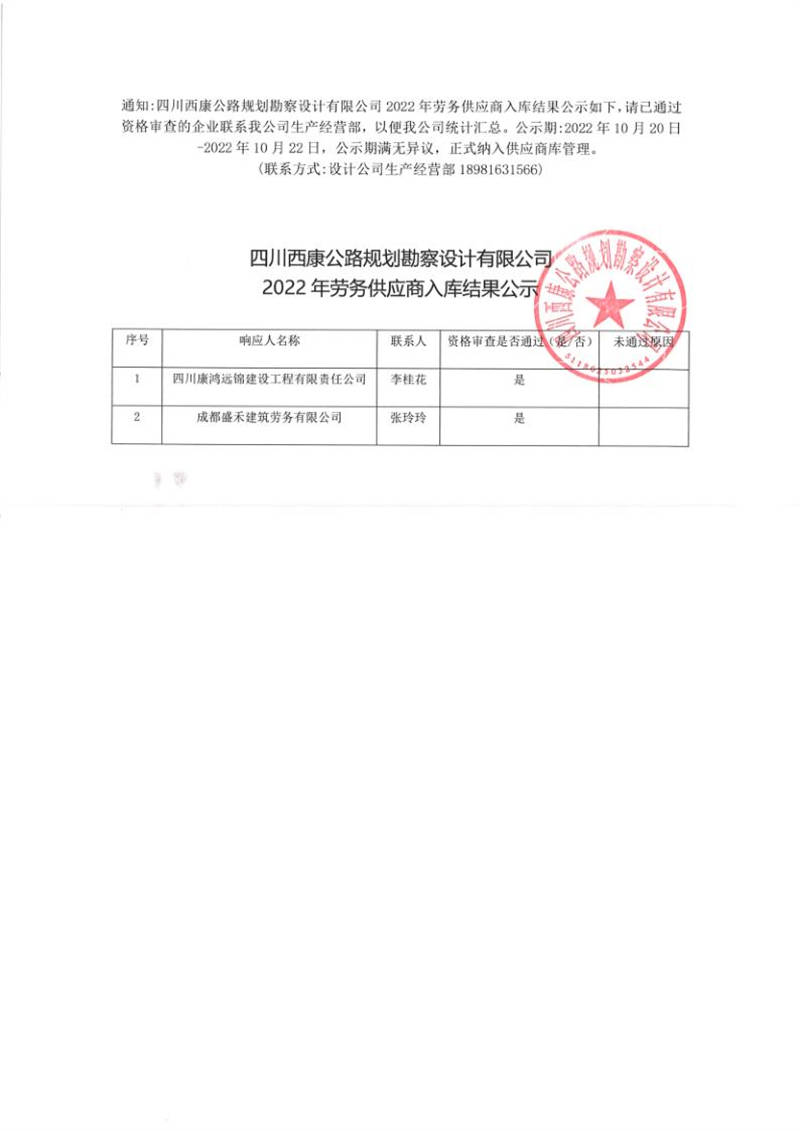 四川西康公路規(guī)劃勘察設(shè)計有限公司2022年勞務供應商入庫結(jié)果公示