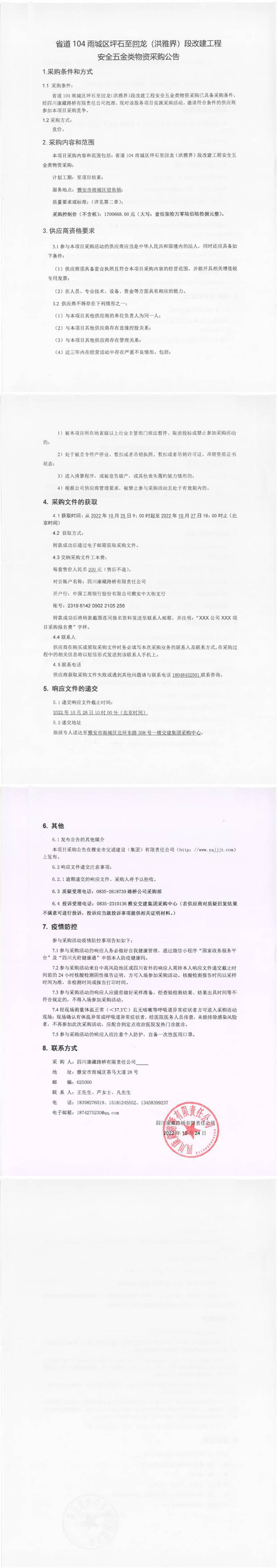 四川康藏路橋有限責任公司省道104雨城區(qū)坪石至回龍(洪雅界)段改建工程安全五金類物資采購公告
