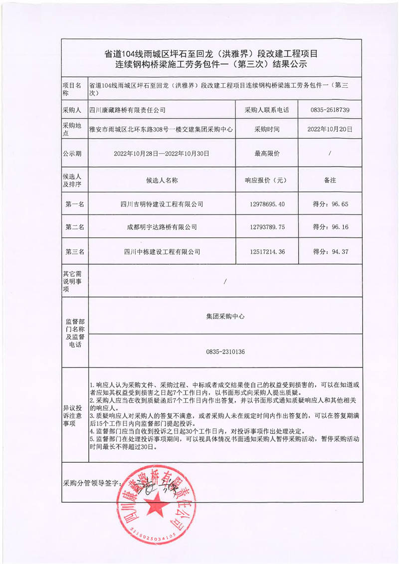 四川康藏路橋有限責(zé)任公司省道104線雨城區(qū)坪石至回龍(洪雅界)段改建工程項(xiàng)目連續(xù)鋼構(gòu)橋梁施工勞務(wù)包件一(第三次)結(jié)果公示