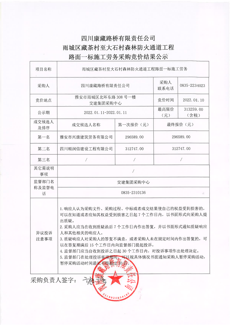 四川康藏路橋有限責(zé)任公司雨城區(qū)藏茶村至大石村森林防火通道工程路面一標施工勞務(wù)采購競價結(jié)果公示