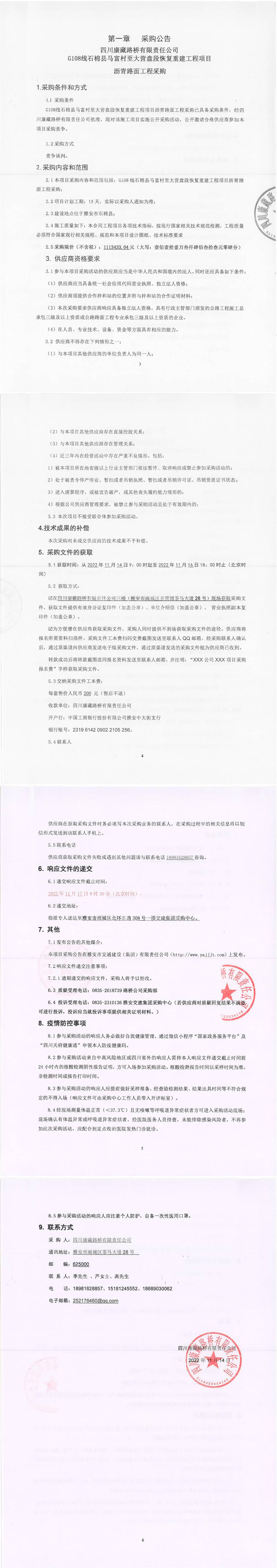四川康藏路橋有限責任公司G108線石棉縣馬富村至大營盤段恢復重建工程項目瀝青路面工程采購公告