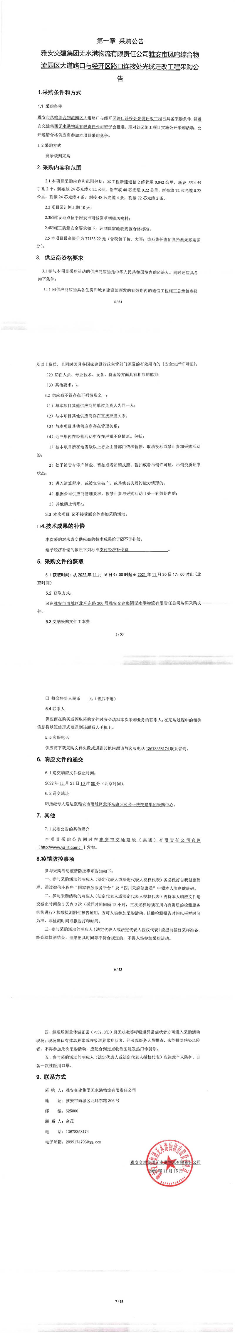雅安交建集團無水港物流有限責任公司雅安市鳳鳴綜合物流園區(qū)大道路口與經(jīng)開區(qū)路口連接處光纜遷改工程采購公告