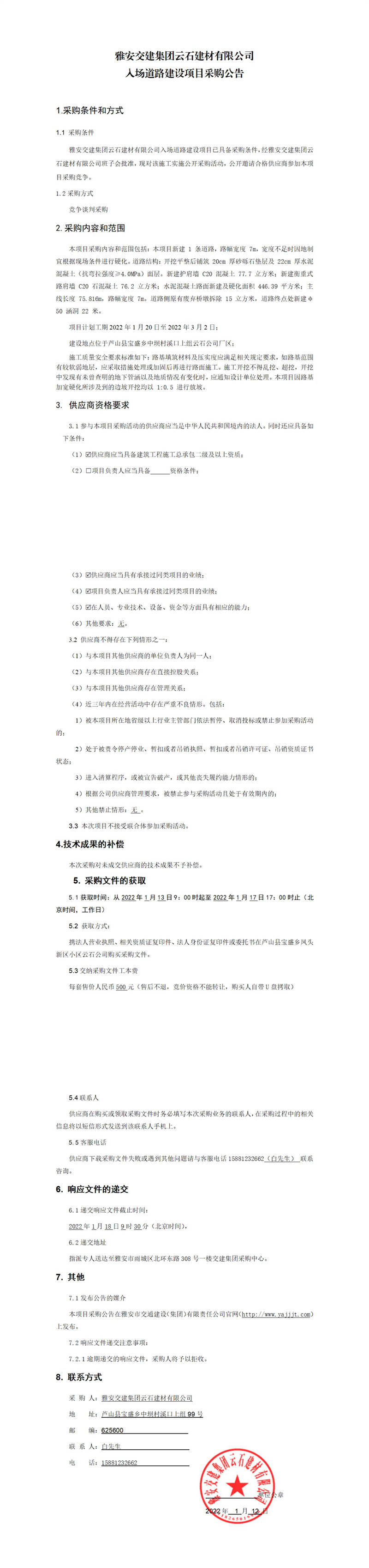 雅安交建集團(tuán)云石建材有限公司入場道路建設(shè)項(xiàng)目采購公告