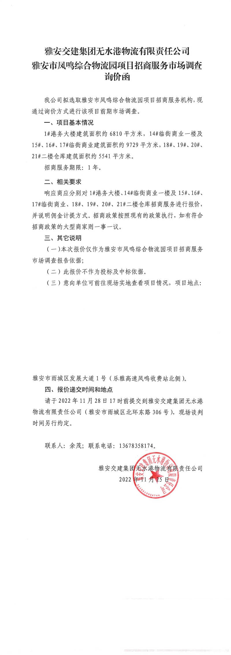 雅安交建集團無水港物流有限責(zé)任公司雅安市鳳鳴綜合物流園項目招商服務(wù)市場調(diào)查詢價函