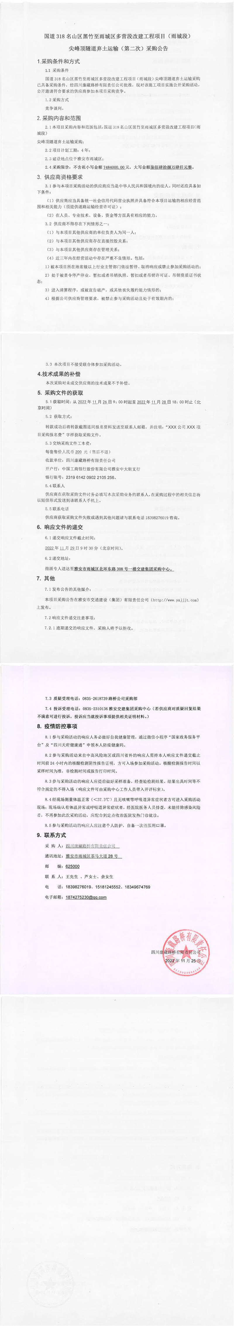 四川康藏路橋有限責(zé)任公司國(guó)道318名山區(qū)黑竹至雨城區(qū)多營(yíng)段改建工程項(xiàng)目(雨城段)尖峰頂隧道棄土運(yùn)輸(第二次)采購(gòu)公告