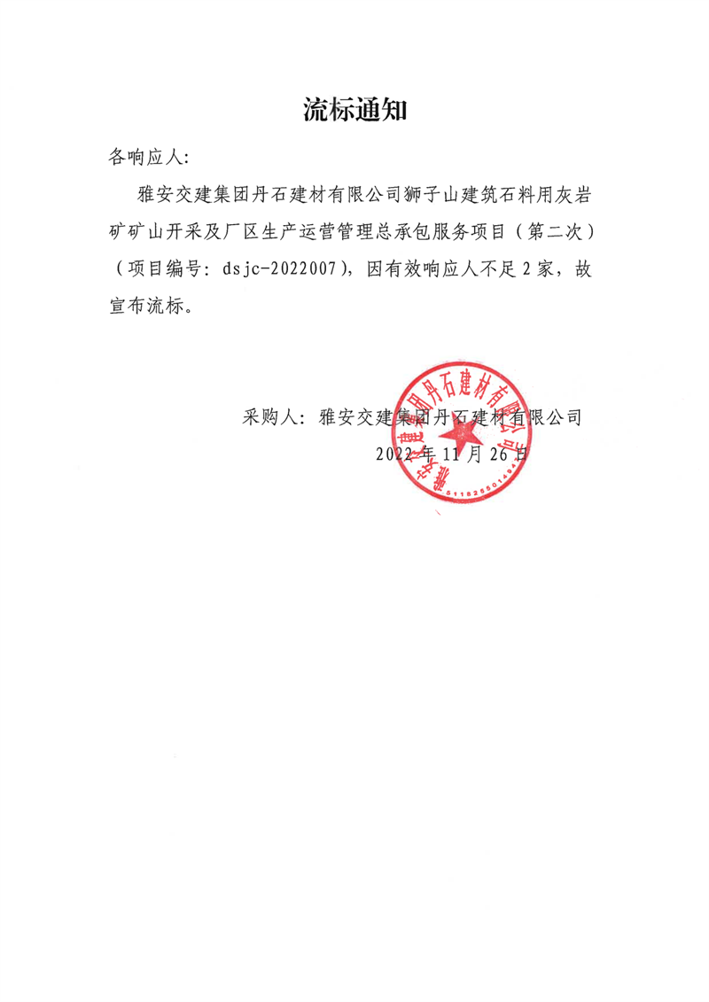 雅安交建集團丹石建材有限公司獅子山建筑石料用灰?guī)r礦礦山開采及廠區(qū)生產(chǎn)運營管理總承包服務項目(第二次)流標通知